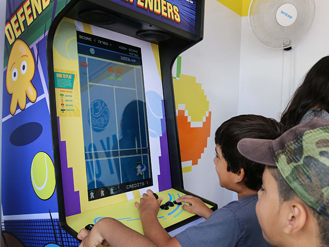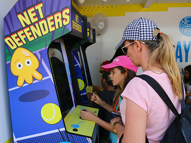 Our team created the concept of video game nostalgia and executed a Tennis Arcade to appeal to the youth's appetite for mobile gaming while sticking to an 8-bit aesthetic that any parent would love. The main draw was Net Defenders, a tennis take on Space Invaders, developed in-house and housed in a classic arcade cabinet. Other games included Rally, an update to the classic game Pong, and a claw machine. Environmental graphics kept with the theme and provided CTA to join Net Generation.